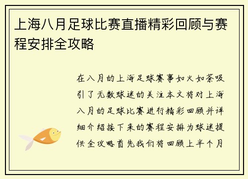 上海八月足球比赛直播精彩回顾与赛程安排全攻略